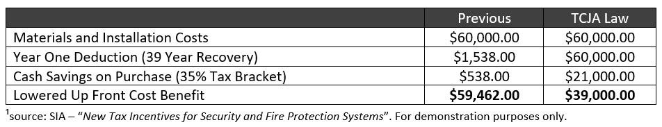 According to SIA’s guide¹, a sole proprietorship business who installed a fire alarm system in a 100,000 square foot building in 2022 could realize the following tax benefit: